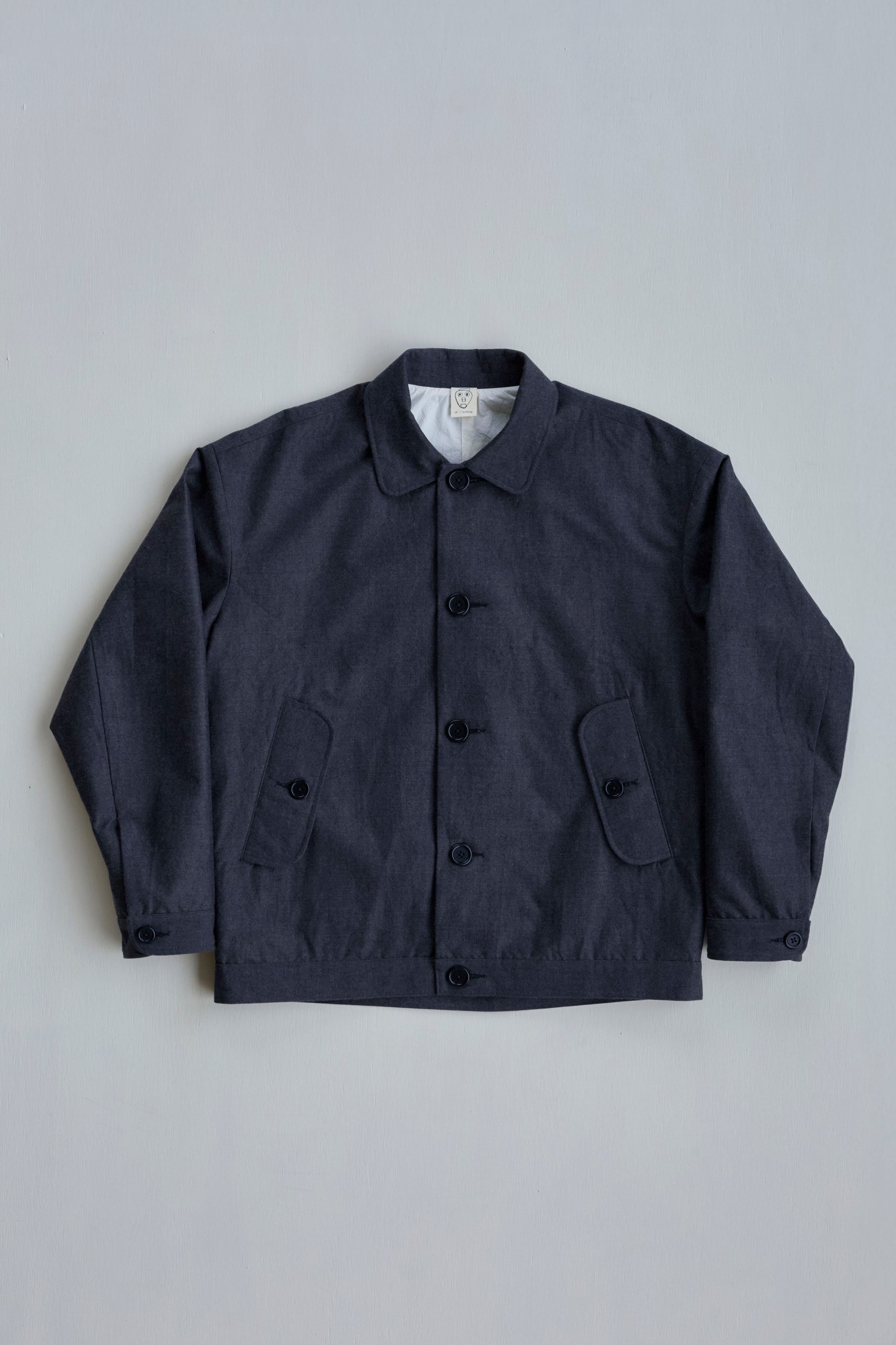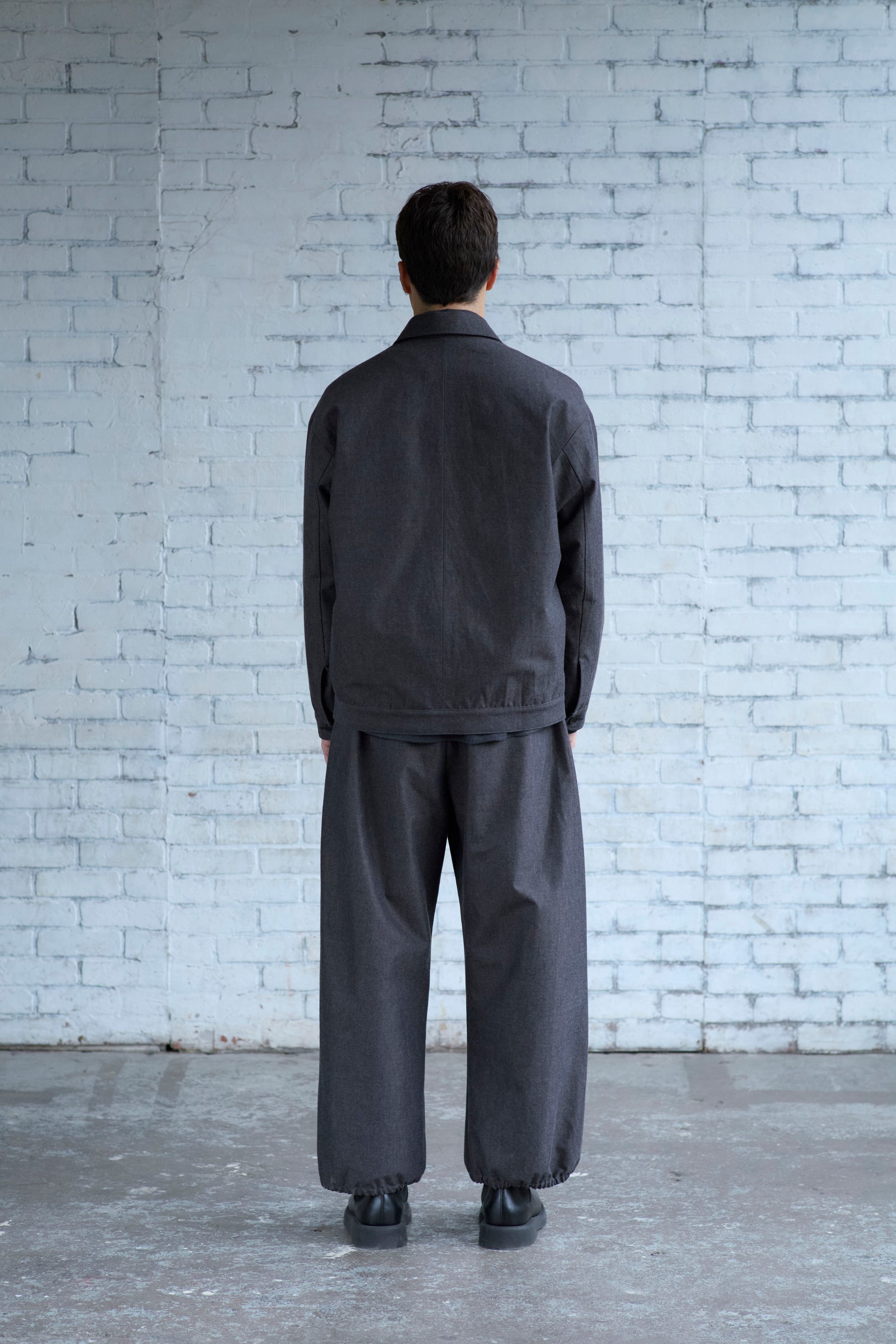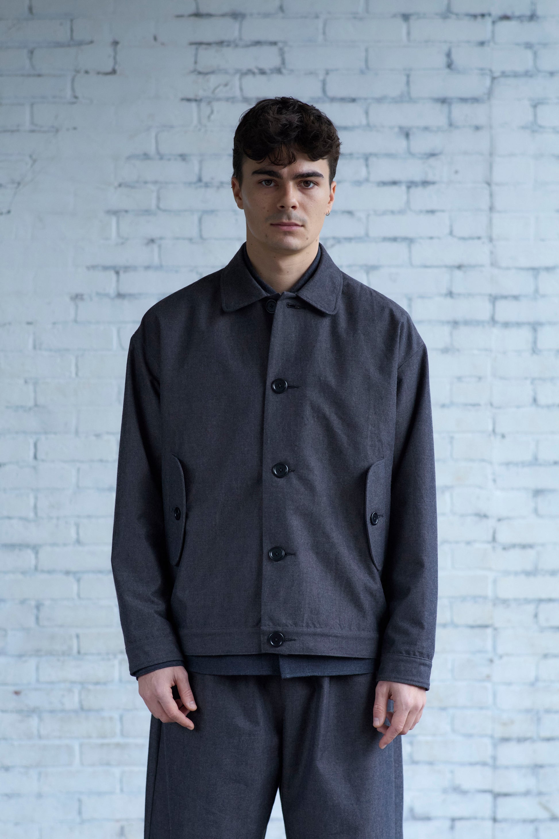A roomy jacket with a tapered silhouette, thanks to pleats at the back. With gently shaped sleeves, flap welt pockets, and one internal patch pocket. Made from a cotton and wool buff cloth with a speckled steel color, thanks to the fine, contrast warp and weft threads. Woven in Japan.