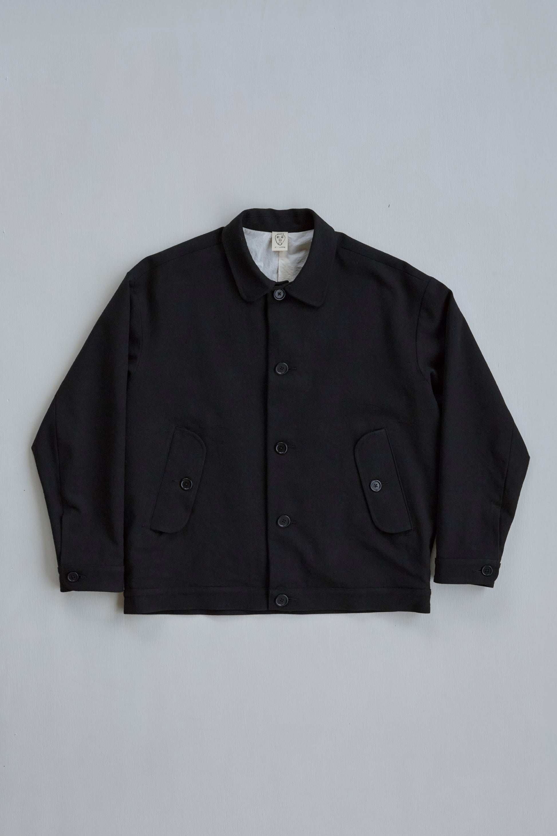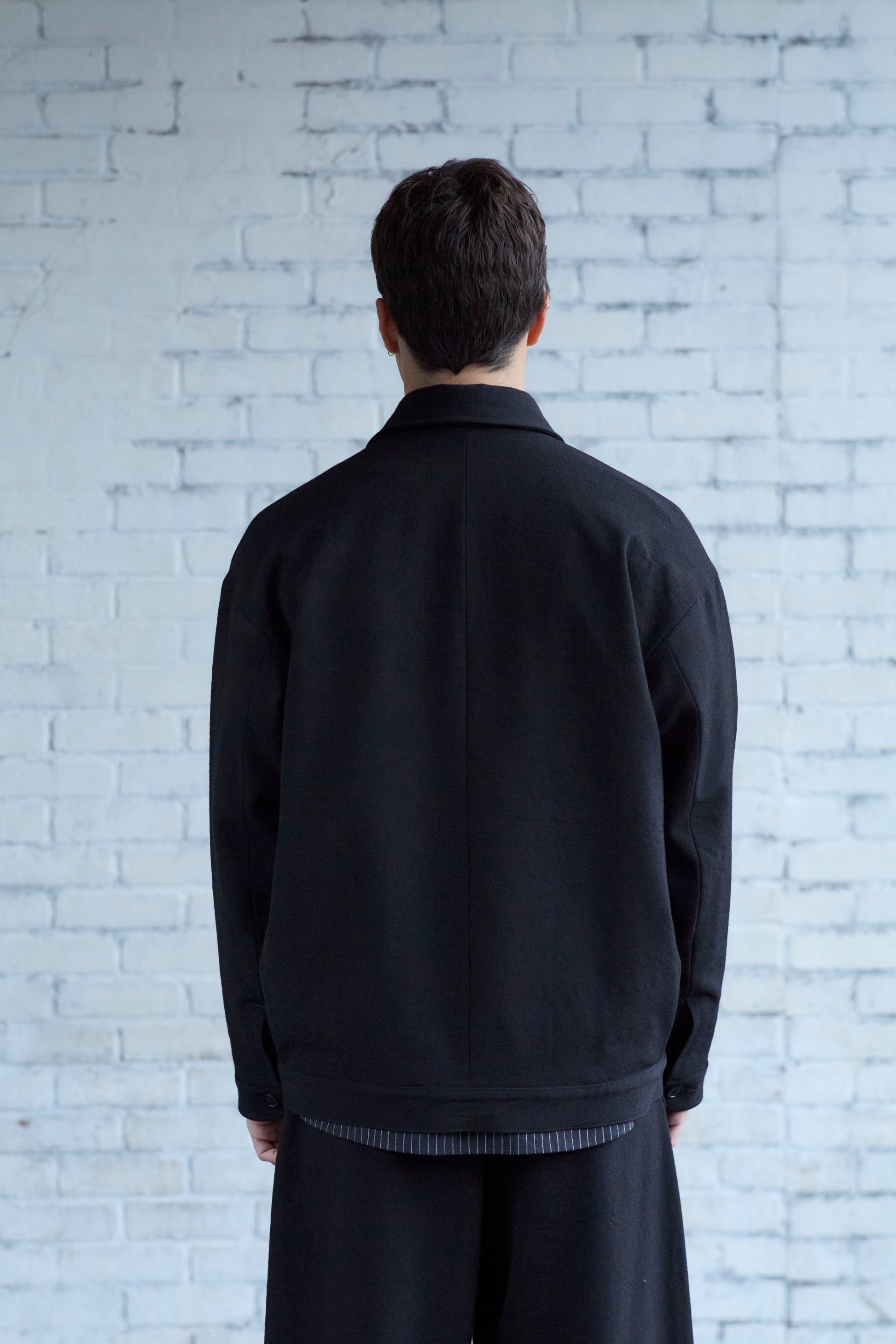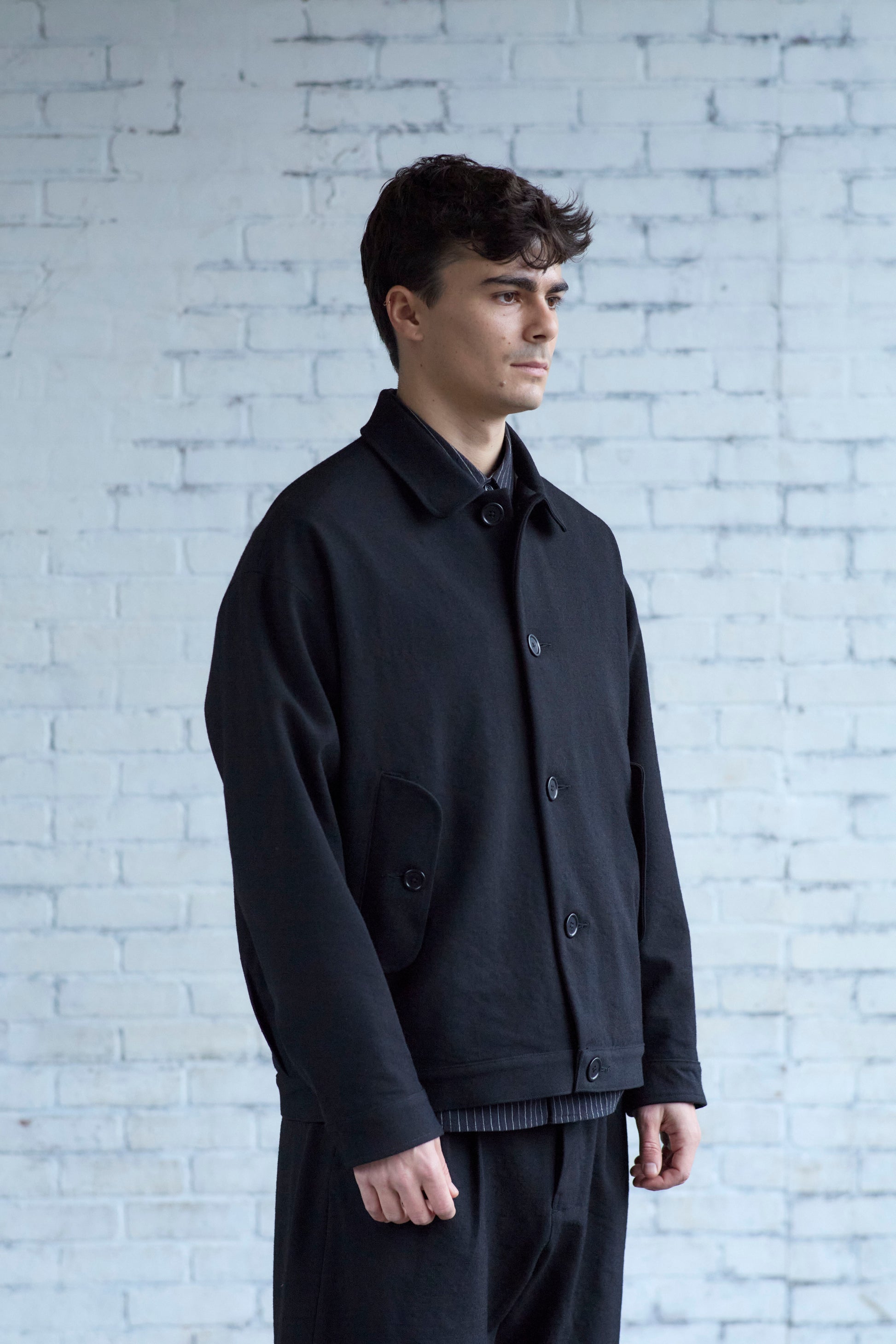 A roomy jacket with a tapered silhouette, thanks to pleats at the back. With gently shaped sleeves, flap welt pockets, and one internal patch pocket. Made from heavy, black wool gabardine woven in Japan. The fabric is tsurizome dyed, resulting in a dense, springy hand with a more pronounced ridged texture on the weave.
