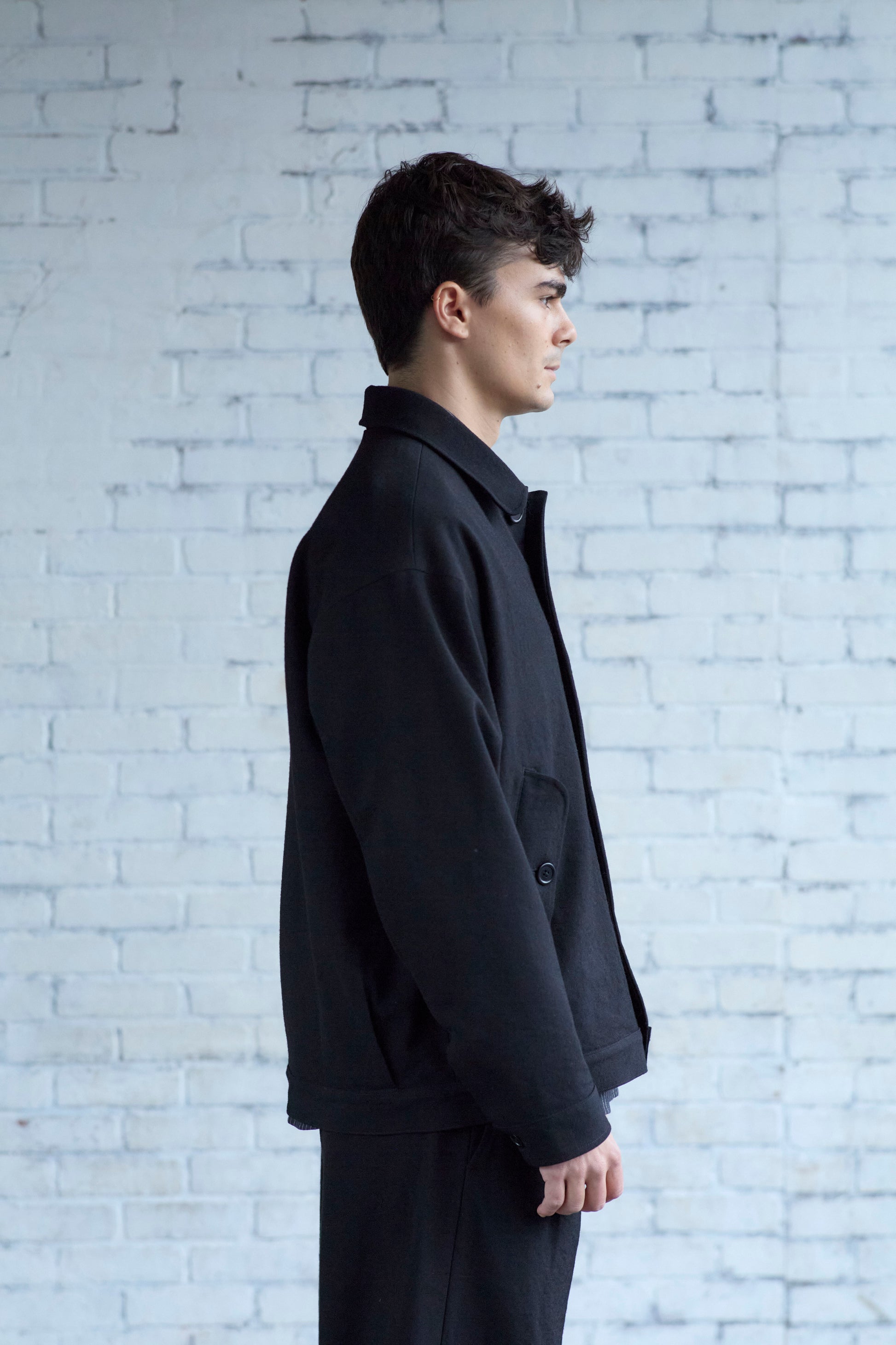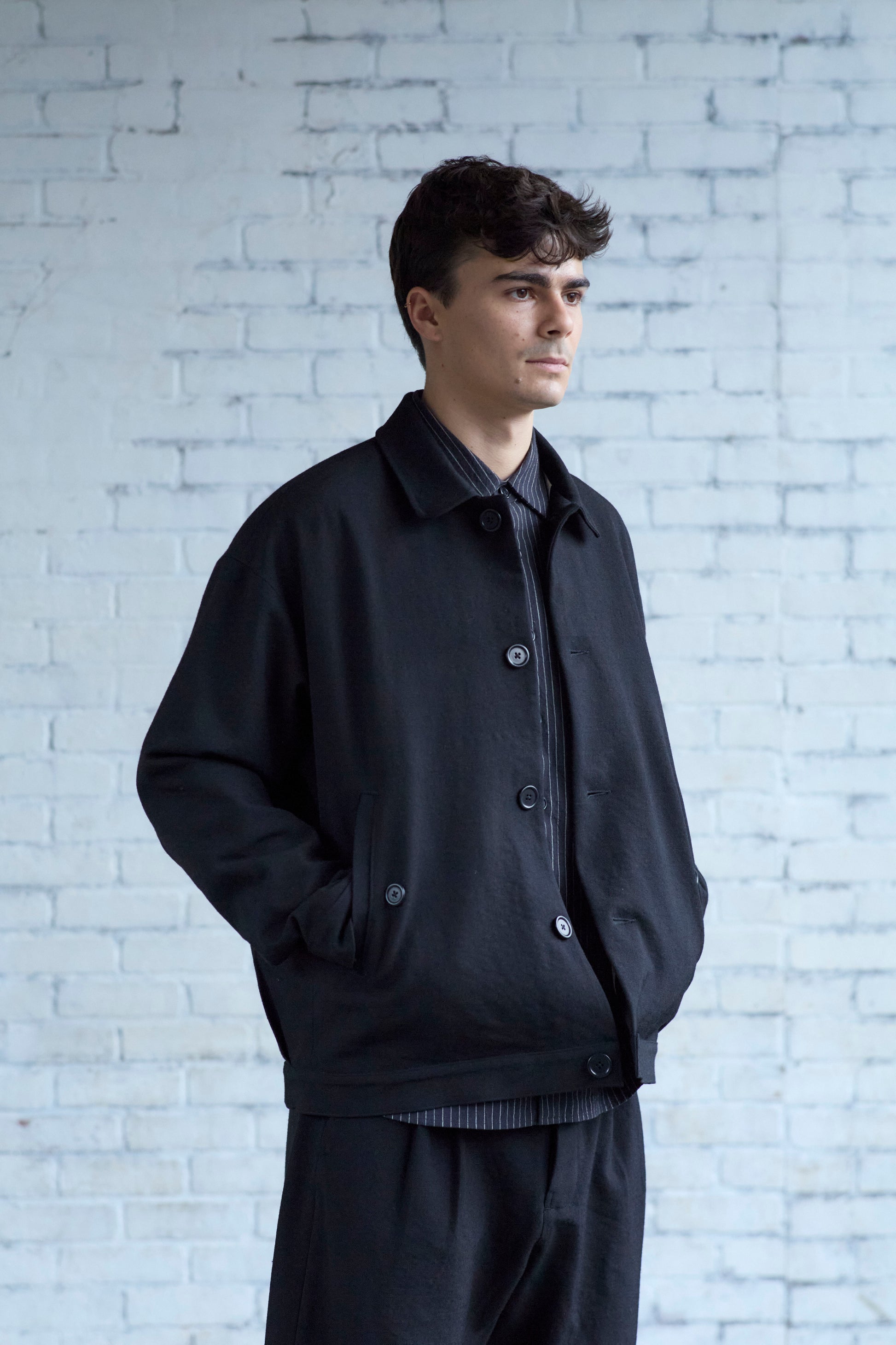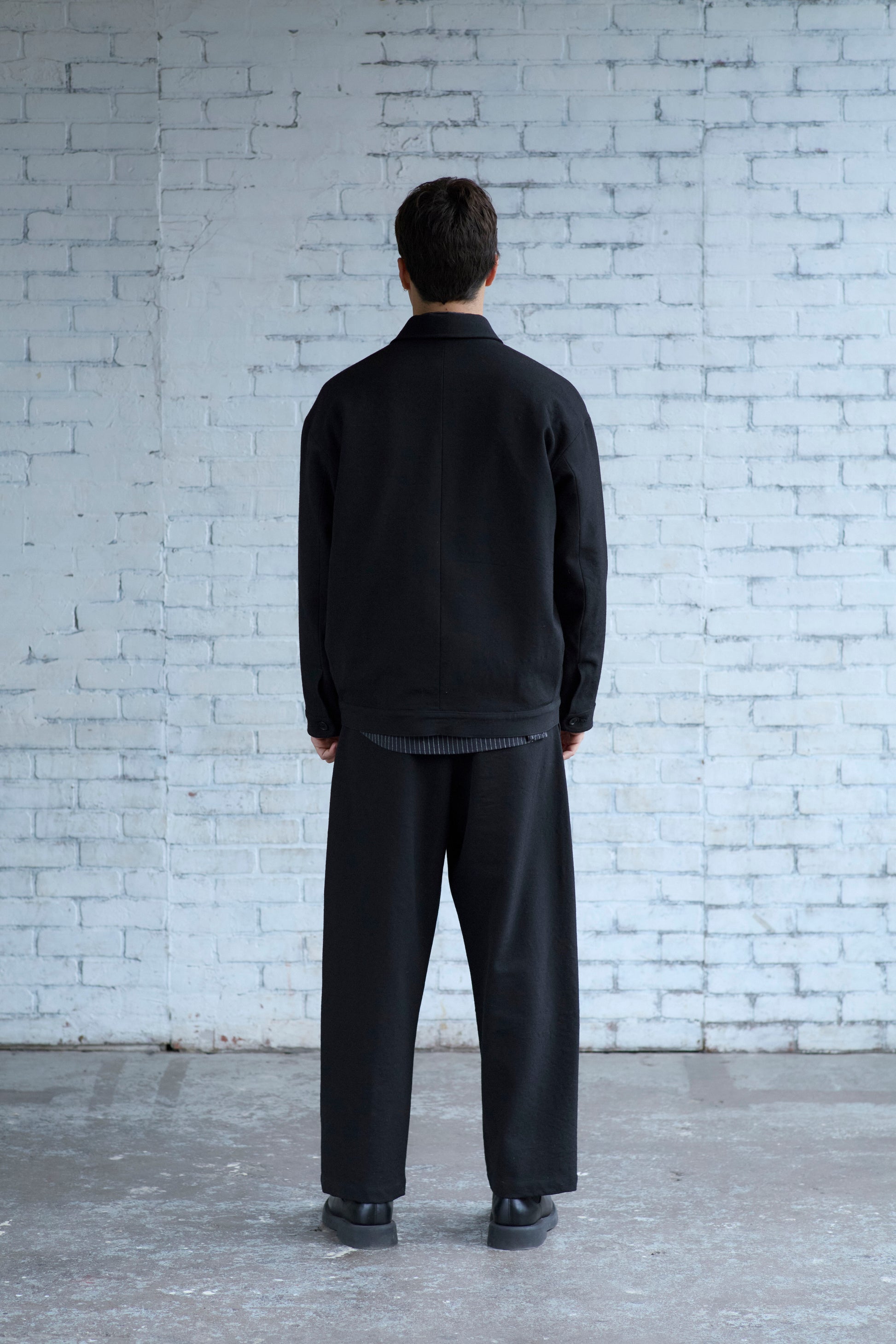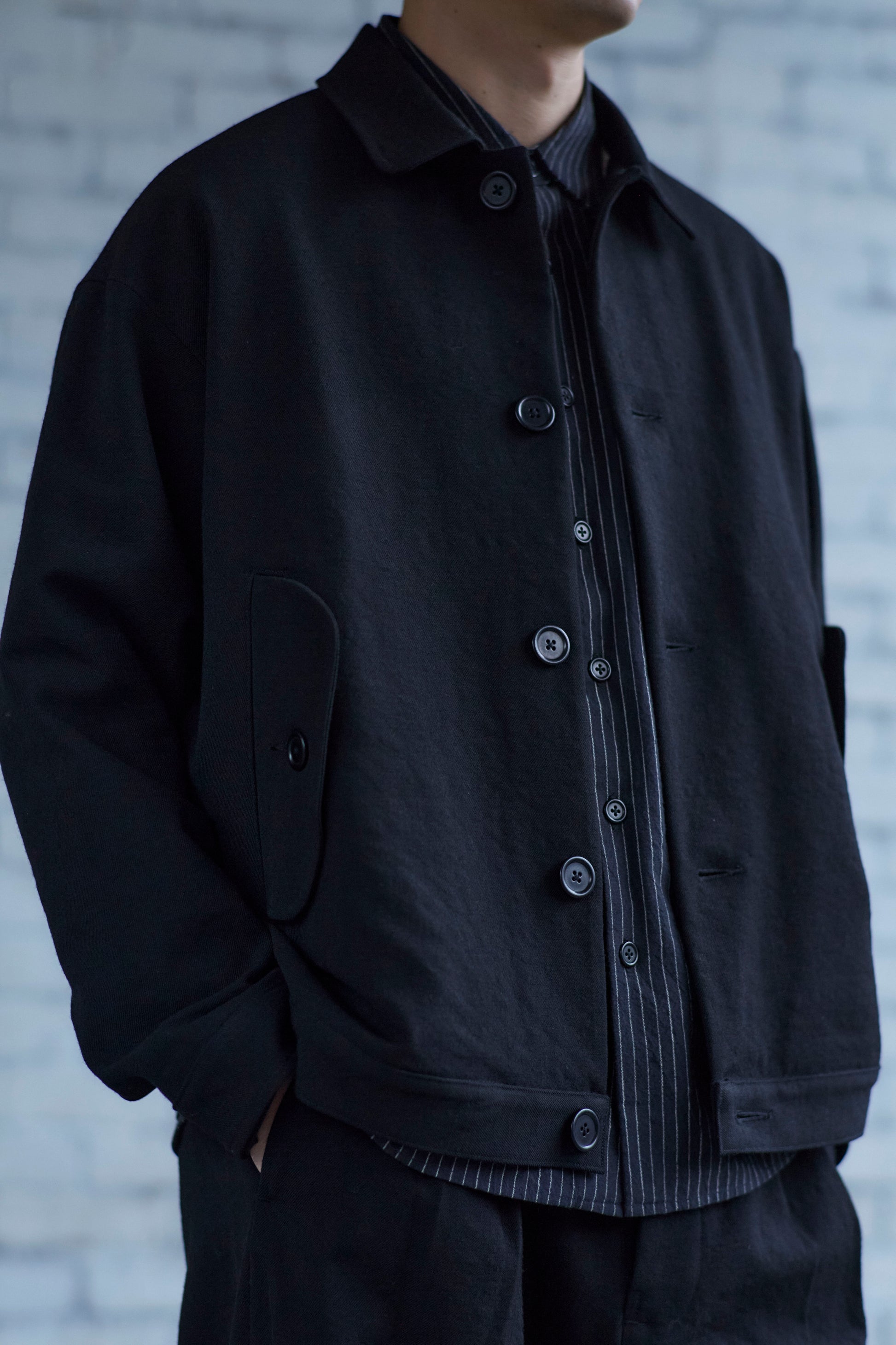 A roomy jacket with a tapered silhouette, thanks to pleats at the back. With gently shaped sleeves, flap welt pockets, and one internal patch pocket. Made from heavy, black wool gabardine woven in Japan. The fabric is tsurizome dyed, resulting in a dense, springy hand with a more pronounced ridged texture on the weave.