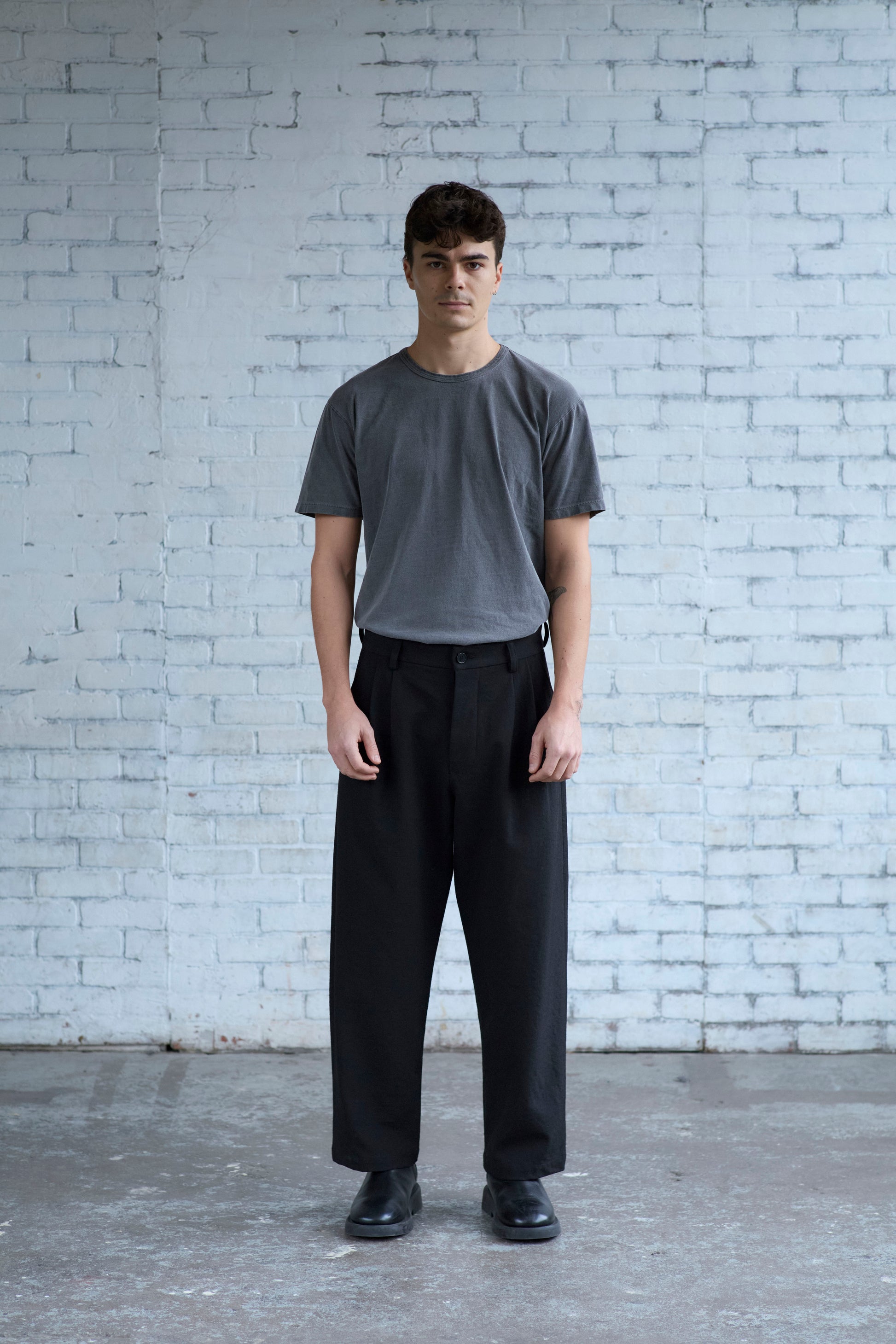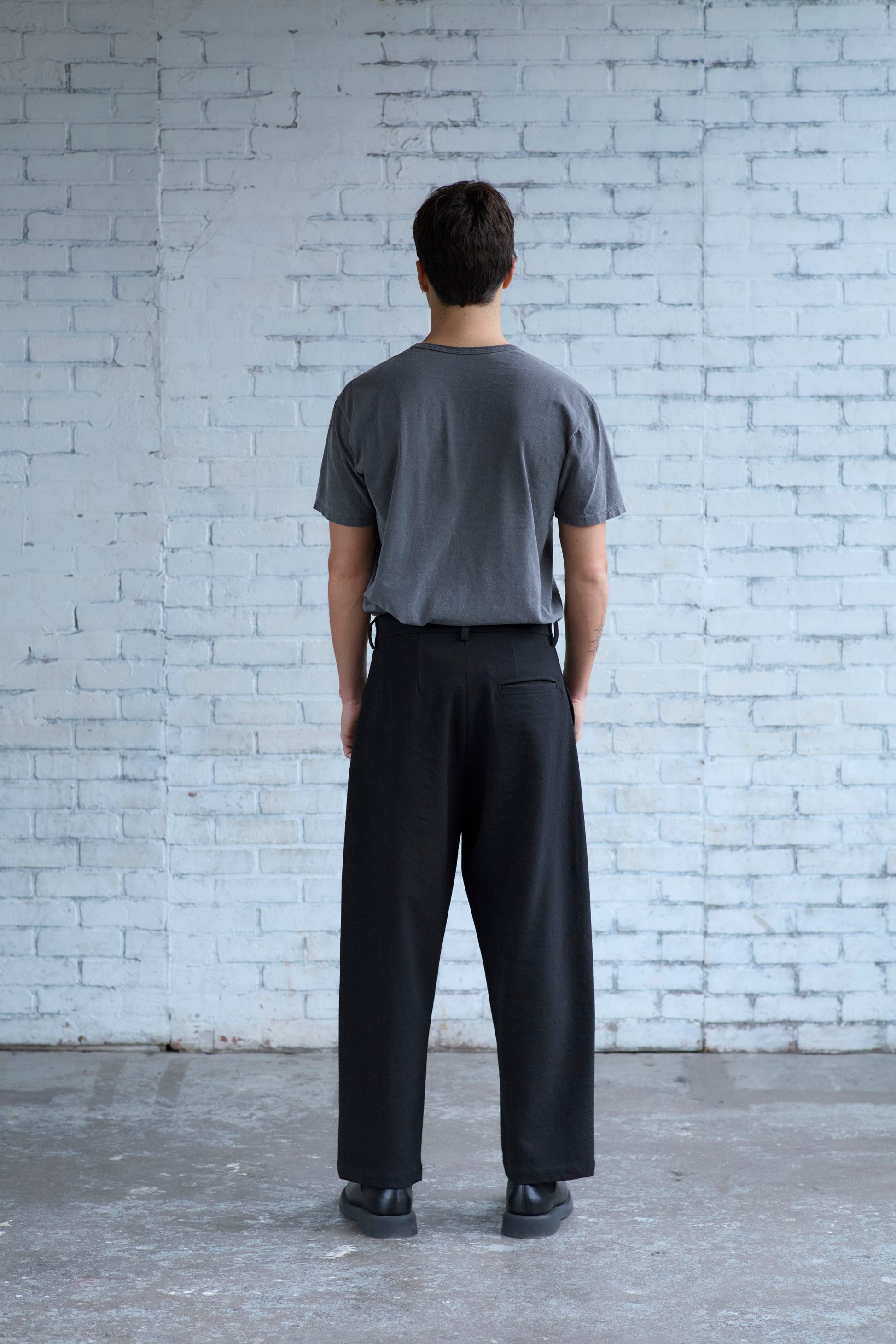 A roomy pant that tapers gently. With two 1" pleats to provide additional volume, a single rear welt pocket, button fly, and a blind-stitched waistband. Made from heavy, black wool gabardine woven in Japan. The fabric is tsurizome dyed, resulting in a dense, springy hand with a more pronounced ridged texture on the weave.