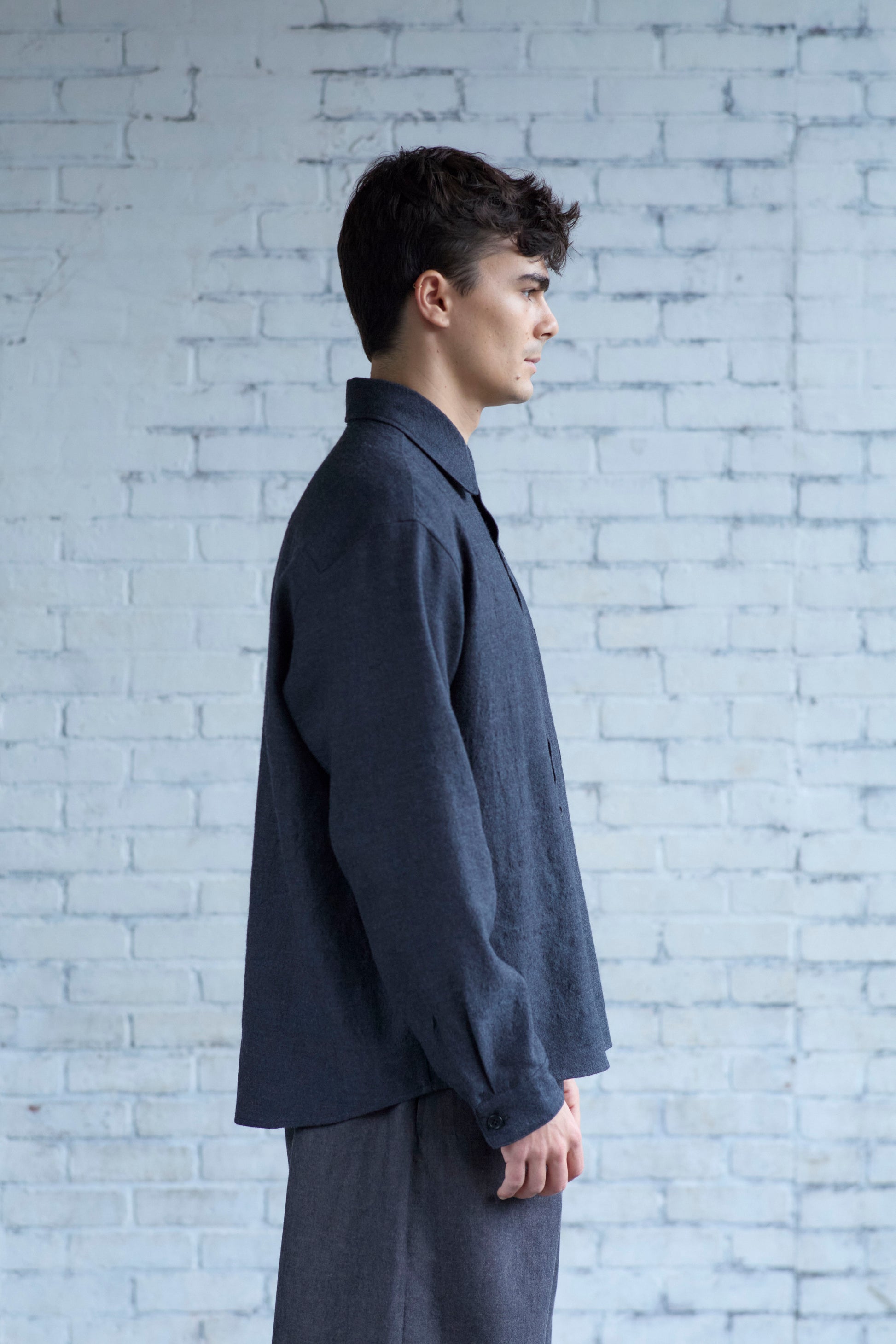 A roomy shirt with a tent-like silhouette. A gently curved hem falls just below the hip. With a rounded collar and single chest pocket. Made from cool charcoal colored wool / linen blend that's been lightly brushed. The fabric undergoes a washing process that shrinks the warp and weft threads in different proportions, giving a slightly raised, gauzy texture.