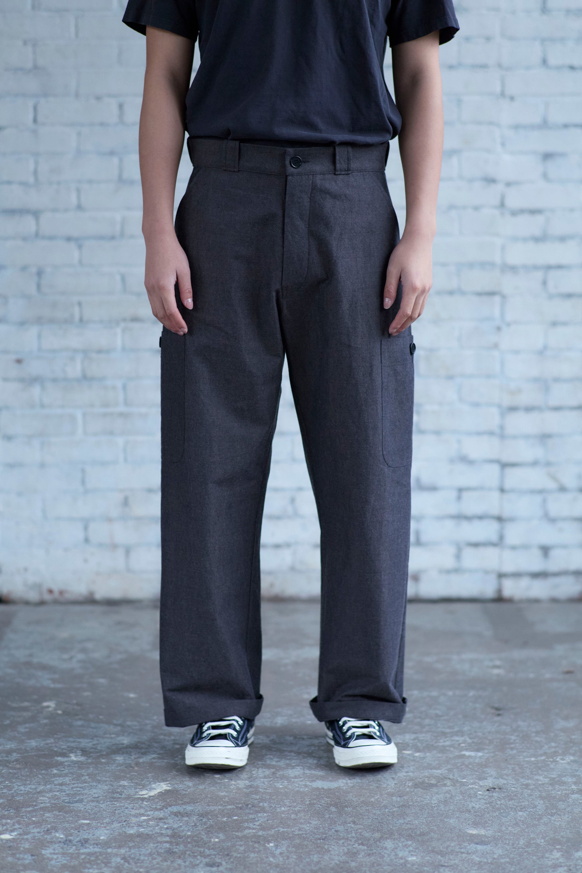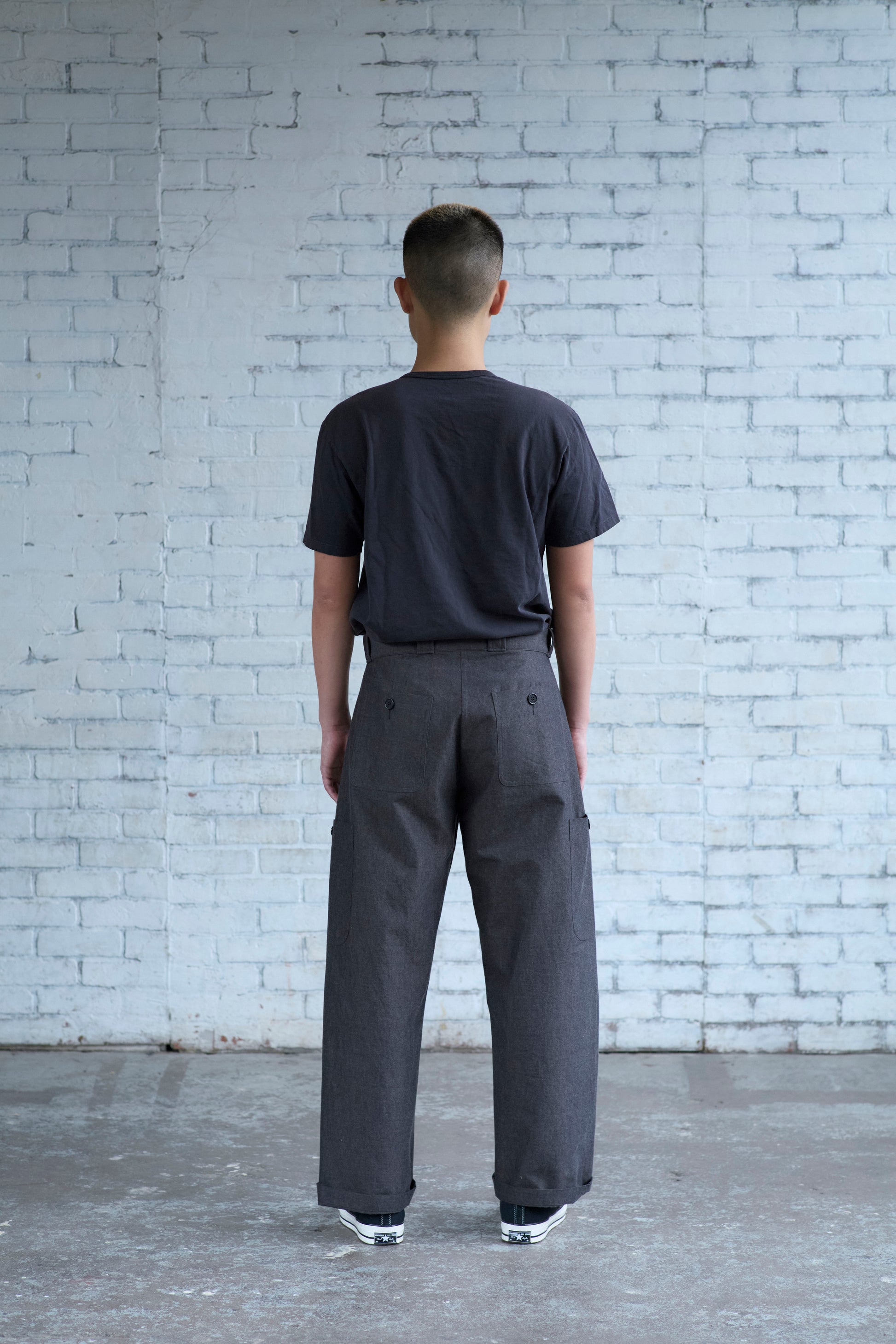 A straight legged pant with angled front pockets, patch pockets at the rear, and large patch pockets at the thigh. Made from a cotton and wool buff cloth with a speckled steel color, thanks to the fine, contrast warp and weft threads. Woven in Japan.