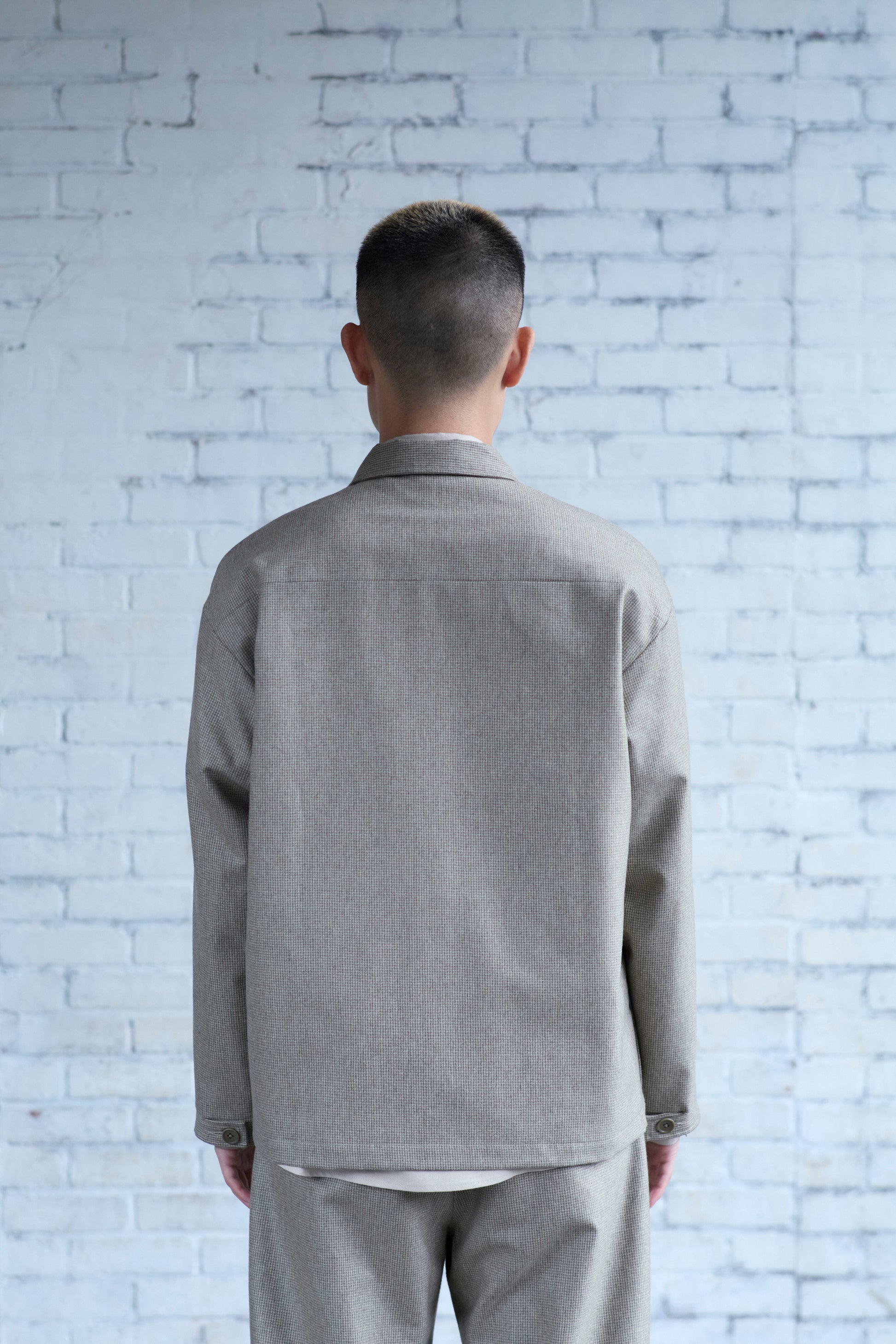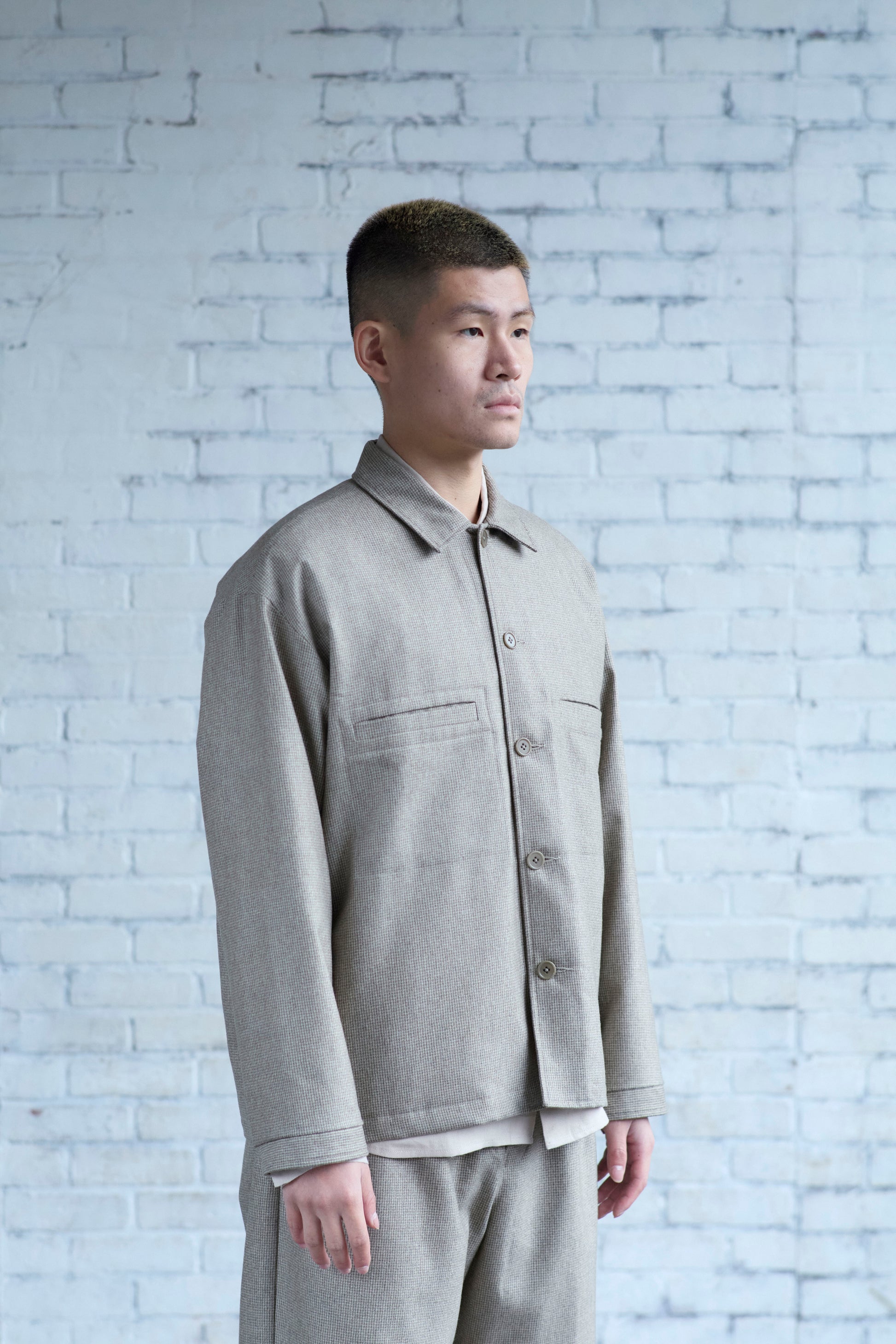 A boxy over-shirt with sewn-through welt pockets at the chest. Updated design includes on-seam hand pockets at the side and an adjustable cuff. Made from a light-mid weight wool and cashmere blended flannel woven in Italy, and lined in a cotton/linen typewriter cloth.
