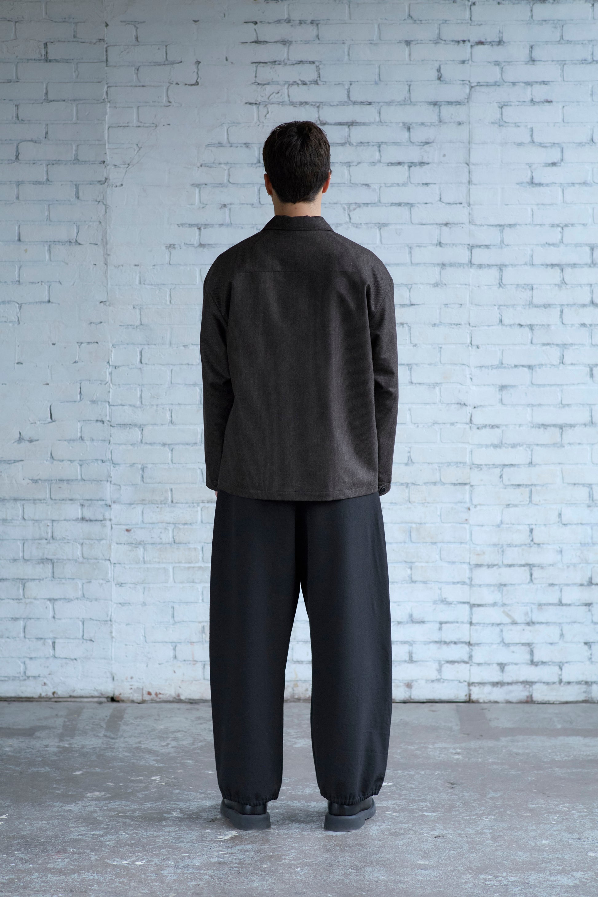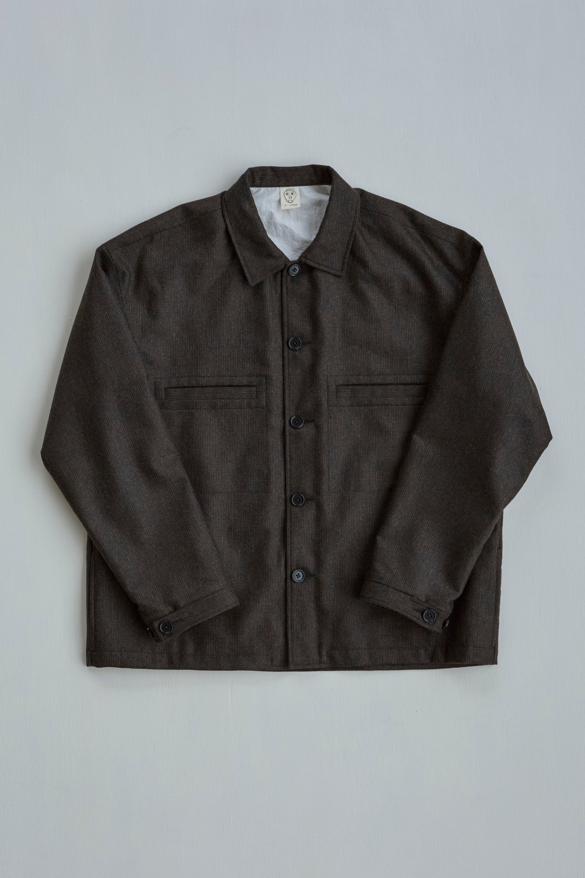 A boxy over-shirt with sewn-through welt pockets at the chest. Updated design includes on-seam hand pockets at the side and an adjustable cuff. Made from a light-mid weight wool and cashmere blended flannel woven in Italy, and lined in a cotton/linen typewriter cloth.